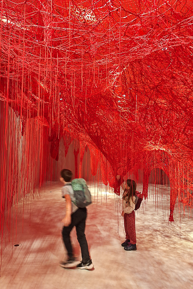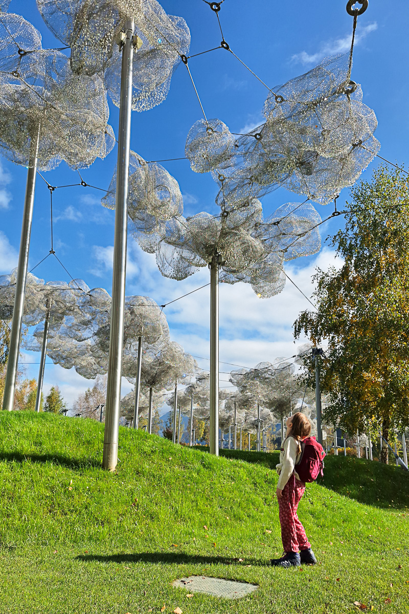 Im Park geht der Spaß für Familien dann so richtig los. Neben weiteren Installationen im Park, die auch die kleinen Besucher:innen verzaubern – wie beispielsweise die Kristallwolke am Spiegelsee – gibt es in der Abenteuerwelt einiges zu entdecken: Ein Highlight sind das Labyrinth und das Design-Karussell mit 15 Millionen Kristallen. Hier kann man mitfahren, so oft man möchte. Der große Spielplatz mit Kugelbahn, Motorikparcours und Wasserspielbereich lädt zum Verweilen ein. Und im Spielturm gibt es auf vier durch Kletterelemente und Rutschen miteinander verbundenen Etagen jede Menge zu entdecken – perfekt auch für Regentage.
