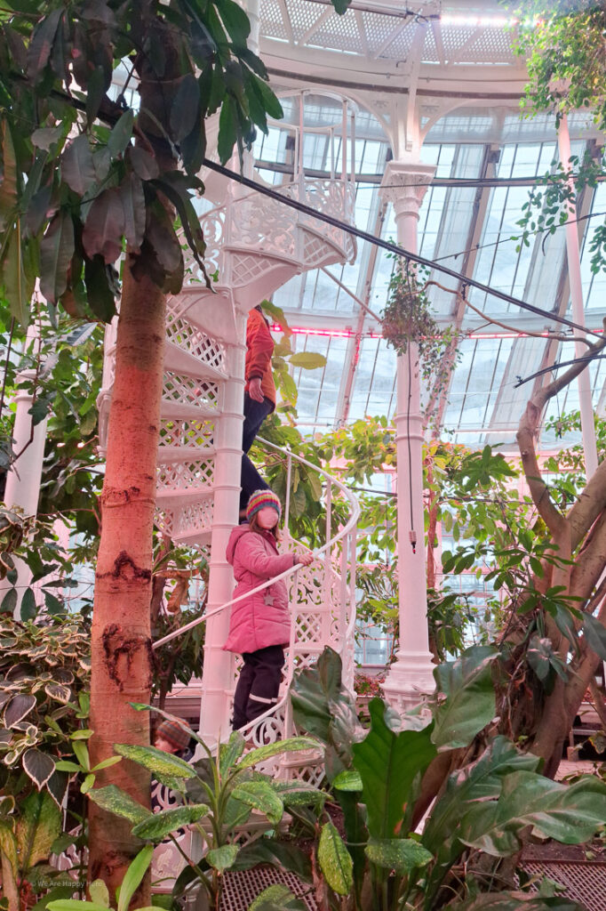 Dafür eignet sich das folgende Ausflugsziel wirklich perfekt für den Winter in Kopenhagen mit Kindern: ein Besuch des Botanischen Gartens mit seinem schönen Palmen- und Schmetterlingshaus. Ganz besonders hat uns hier gefallen, dass man im großen Palmenhaus sogar die Wendeltreppen begehen konnte (im Palmenhaus bei uns in Wien ist das nicht möglich) und dann auch auf der oberen Etage einen Rundgang machen konnte.