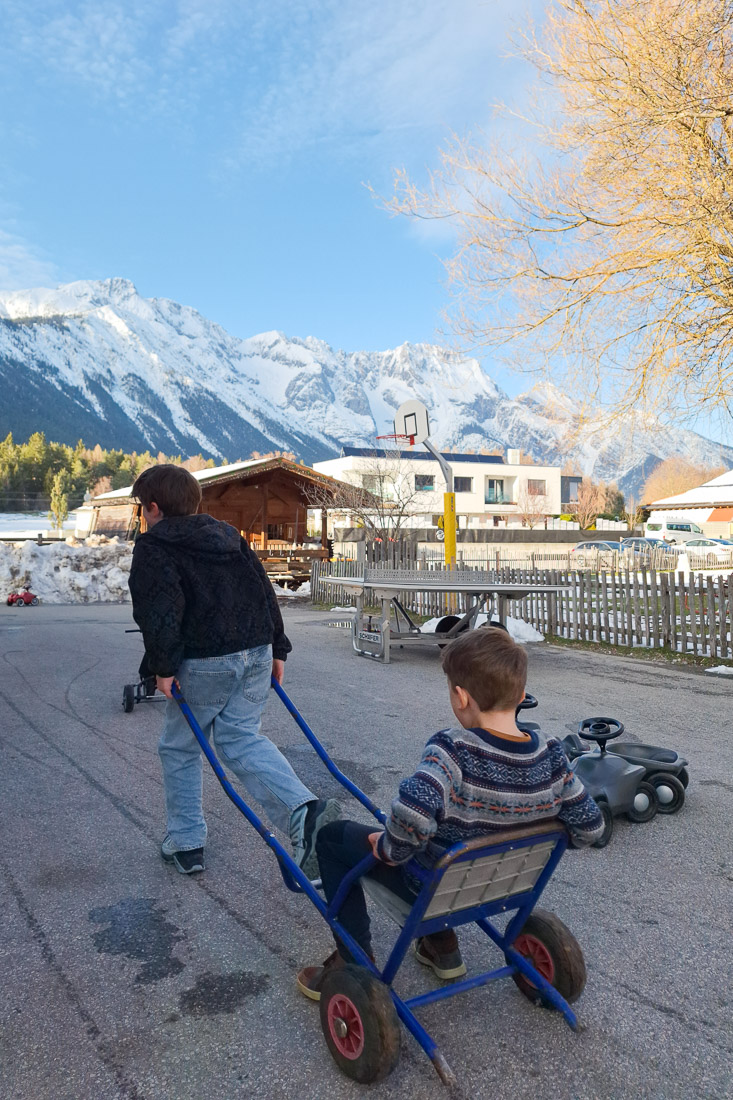 Auch super fein: Mit den Rädern (ca. 10 Minuten) oder einfach zu Fuß (ca. 20 Minuten) zum hoteleigenen Waldspielplatz “Larchplatzl” wandern. Dort waren wir mehrmals und jedes Mal war der Schnee ein bisschen mehr geschmolzen… Es gibt dort Baumhäuser, Holzhütten, einen Motorik-Parcours, eine Riesenschaukel, einen Flying Fox (der war bei uns leider noch in Winterpause), ein Riesen-Tipi, einen Grillplatz und, und, und… Das “Larchplatzl” ist ein wunderschöner Waldplatz mit toller Aussicht auf die Berge und regt zum “Waldbaden” und kreativen Spielen in der Natur an.