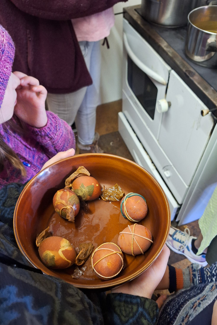 Das “Mundräubern” lernen wir gleich an unserem ersten Nachmittag im Hotel Stern kennen. Beim Mundräubern gehen wir mit Elfi durch den Kräutergarten und die Wiesen und sammeln Essbares, das dann gemeinsam verkocht wird. Beziehungsweise, weil am Tag unserer Ankunft vom Wintereinbruch der vergangenen Tage noch eine Schneeschicht über den Wiesen liegt, machen wir ausnahmsweise ein Ersatzprogramm: Wir färben und verzieren Ostereier mit Lebensmitteln. So viel sei verraten: Für die Kinder und auch uns Erwachsene war das ein gemeinames Schaffen und Tun, das uns noch lange in Erinnerung bleiben wird. Vielen Dank an Elfi für das schöne Erlebnis!