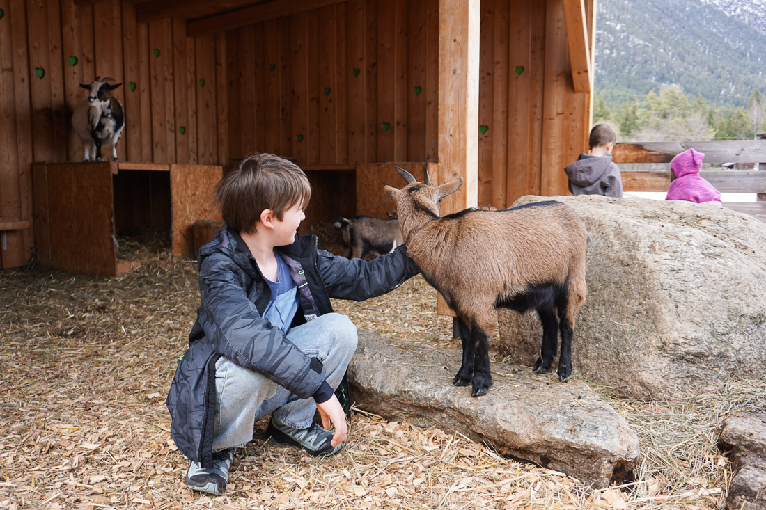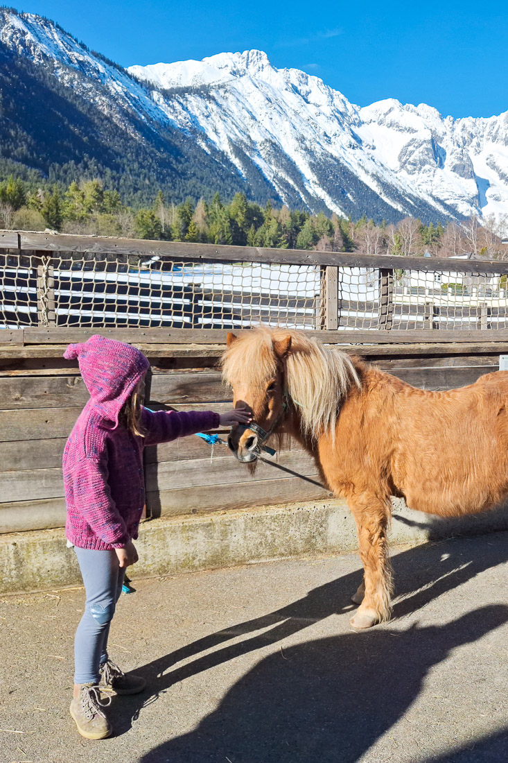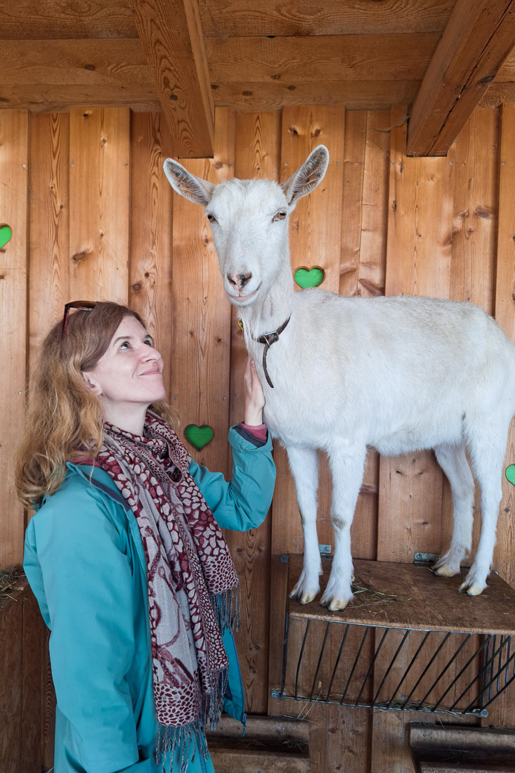 Im Hotel Stern gibt es auch einen Bauernhof. Besonderes Highlight: das tägliche Tiere füttern mit Opa Toni. Dabei können die Kinder jeden Abend selbst mithelfen, wenn die Ziegen, Ponys und Kaninchen versorgt werden. Das Ziegengehege darf außerhalb der Ruhezeiten sogar betreten werden. Manche der Ziegen sind richtig verschmust, vor allem Bärli hat es uns angetan – ist die lieb!