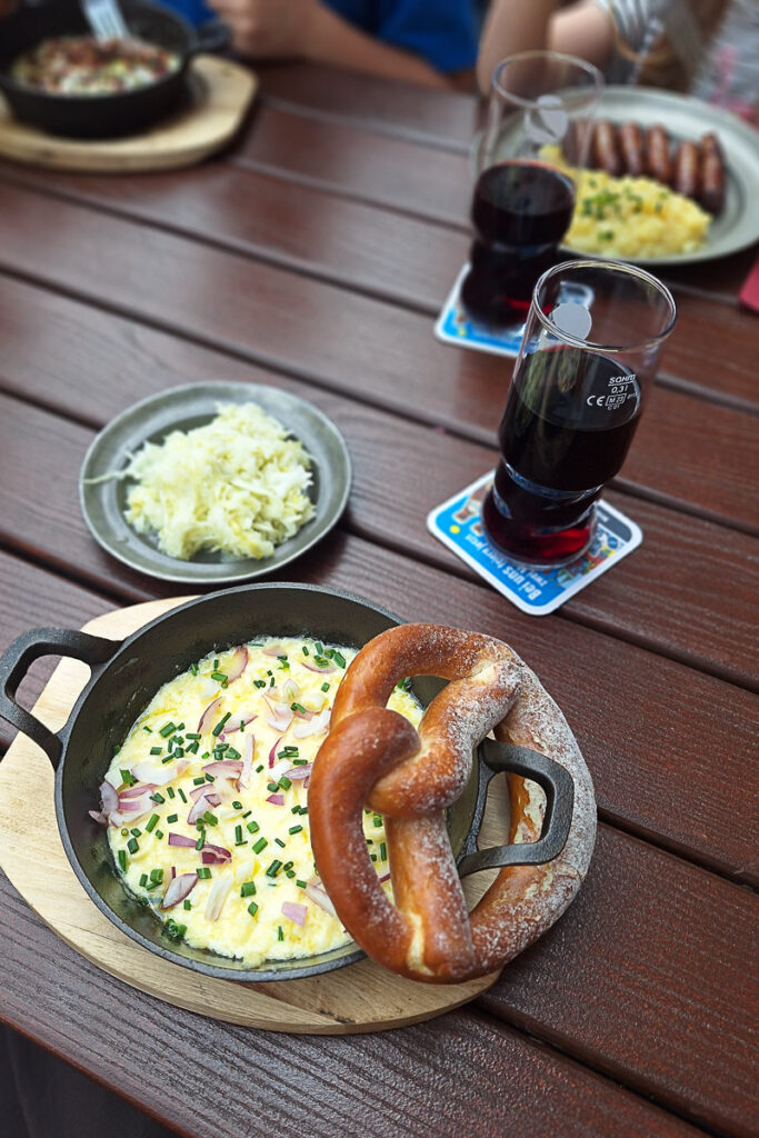 Was wäre Nürnberg ohne seine Bratwürste? Die historische Bratwurstküche “Zum Gulden Stern” geht zurück bis ins Jahr 1419 und ist somit die älteste der Welt. Die Gaststube ist ein Unikat! Wir sind zwar draußen auf der Terrasse gesessen, haben aber natürlich einen Blick hineingeworfen. Hier gibt es die Original Nürnberger Röstla nach traditionellem Rezept. Aber selbst Vegetarier:innen – wie ich – finden ein paar Optionen auf der Speisekarte. Ich kann das “Sternla” Käsefondue (Bild links) nur empfehlen.
