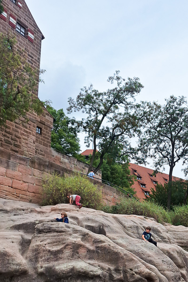 Es ist durchaus auch mit Kindern nett, durch das Areal der Kaiserburg von Nürnberg zu spazieren. Drinnen waren wir zwar nicht, doch das Außengelände ist frei zugänglich und bietet auch einen schönen Blick über die Dächer der Altstadt. Nicht verpassen dürft ihr dabei den “Affenfelsen”, das ist ein Sandsteinfelsen südlich der Kaiserburg, der zum Klettern und Kraxeln einlädt (siehe linkes Bild – entdeckst du unsere drei Kids?):