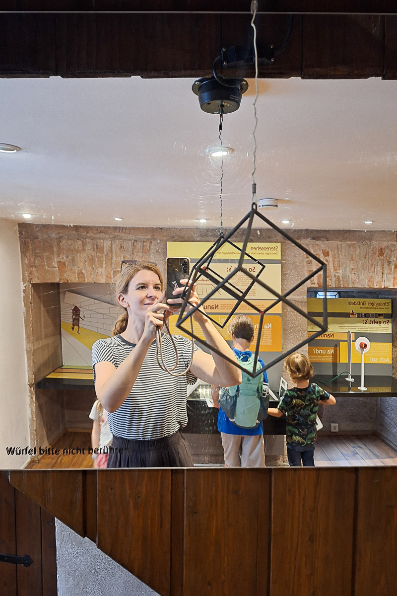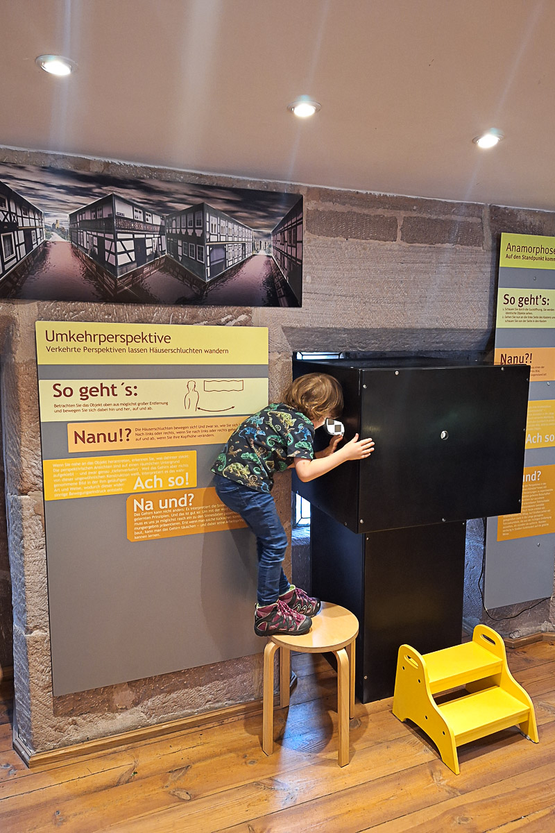 Der Turm der Sinne ist ein Geheimtipp und für uns war er ein absoluter Glücksgriff. Hier erwartet euch ein interaktives Hands-On Museum zu den Themen Wahrnehmung, Illusionen und Sinnestäuschungen. Auf sechs Stockwerken mit jeweils einem Raum (es ist eben ein richtiger Turm) gibt es jede Menge Verblüffendes zu entdecken und von oben dann sogar eine tolle Aussicht auf die Altstadt. Ich würde den Turm der Sinne zwar erst ab ca. 6 Jahren so richtig empfehlen, doch auch jüngere Geschwisterkinder finden hier bestimmt einiges. Auch für Erwachsene ist es toll, ich persönlich liebe ja solche Museen!